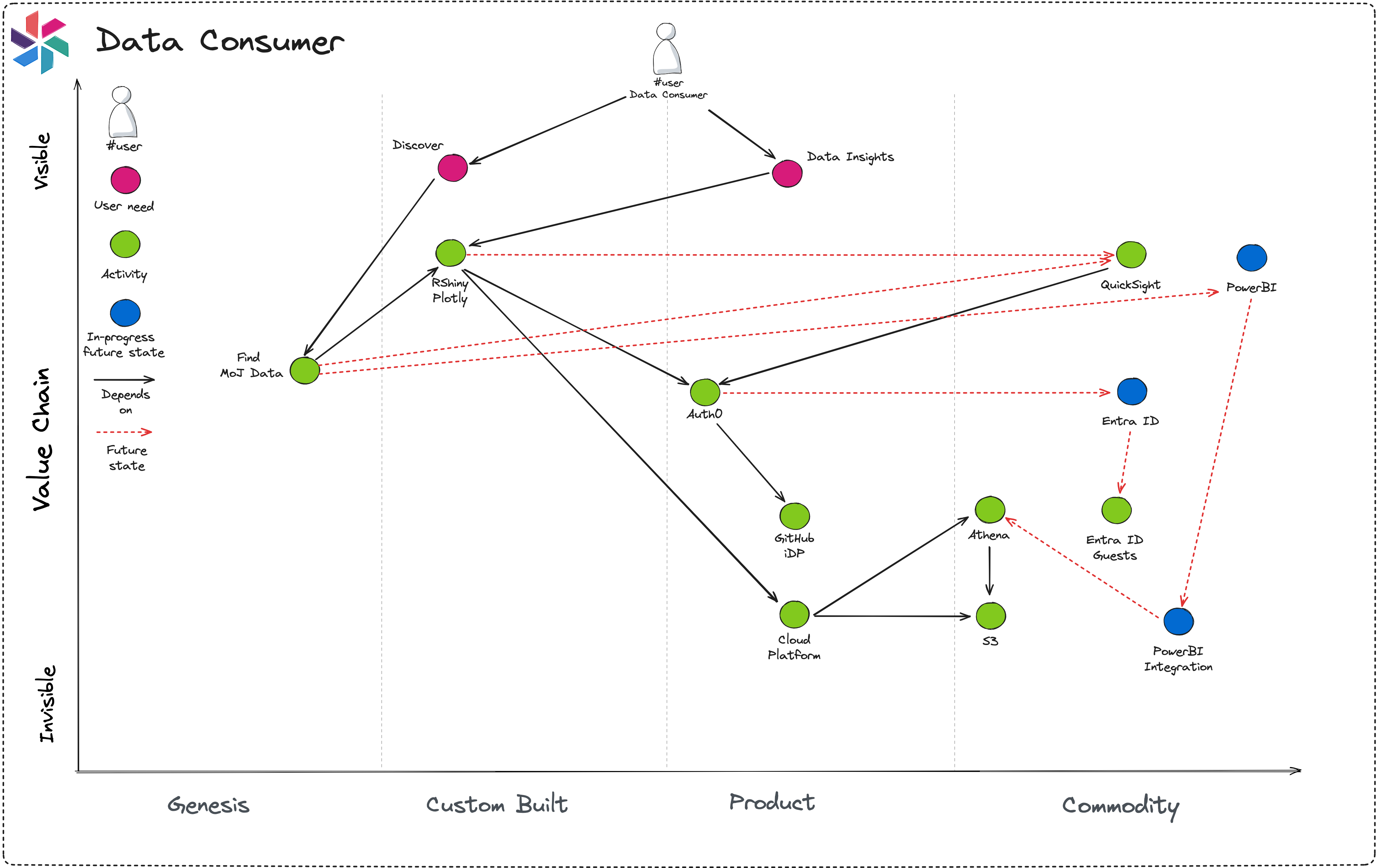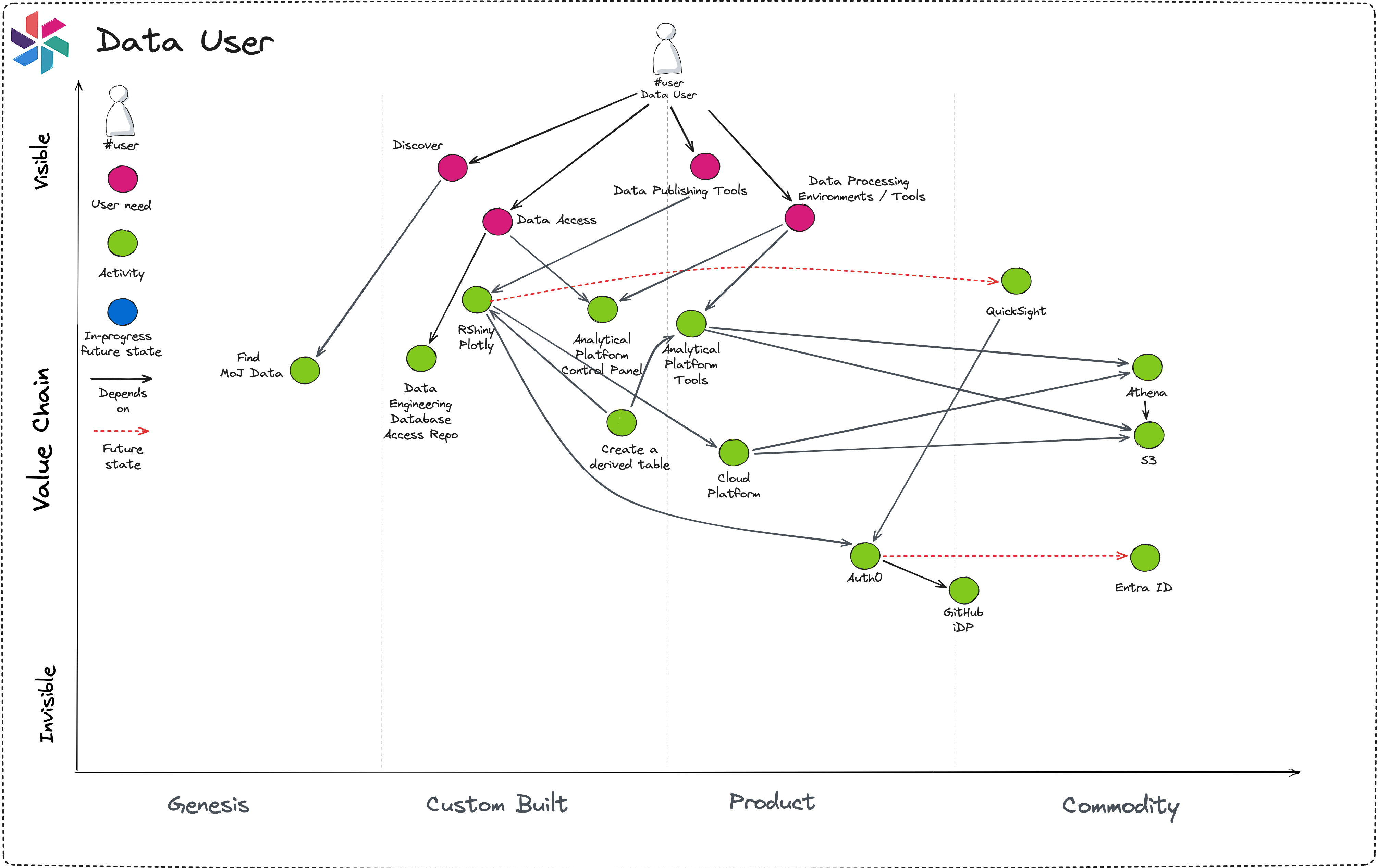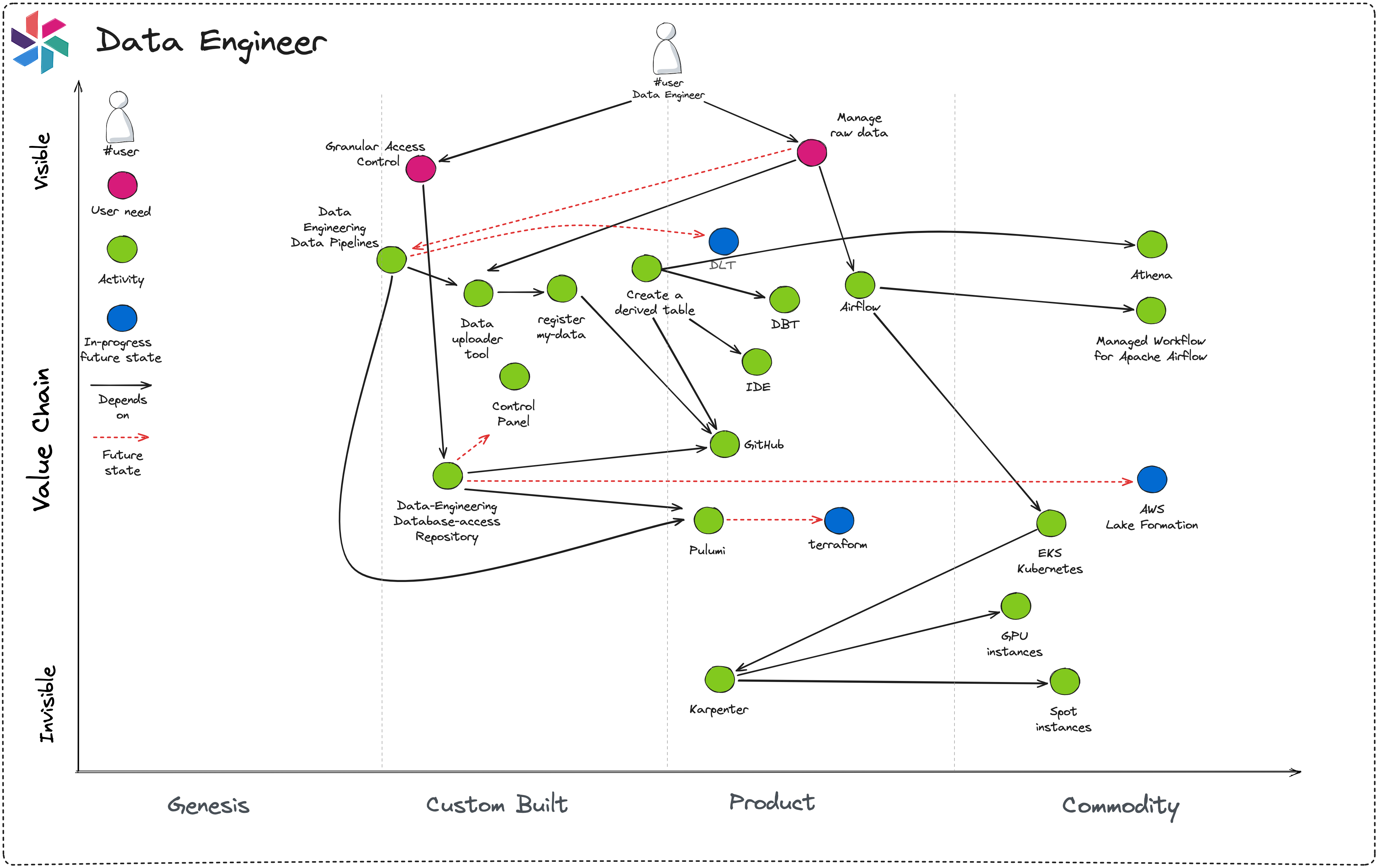 Wardley maps offer a visual framework to understand and plan the evolution of the Analytical Platform. They help map out system components, their dependencies, and their maturity, empowering teams to: